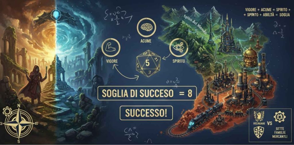 Il Tiro Entro: Quando l’esito di un’azione è incerto, tiri un dado a 12 facce (d12). L’azione riesce se il risultato è uguale o inferiore a un valore prefissato chiamato Soglia di Successo.