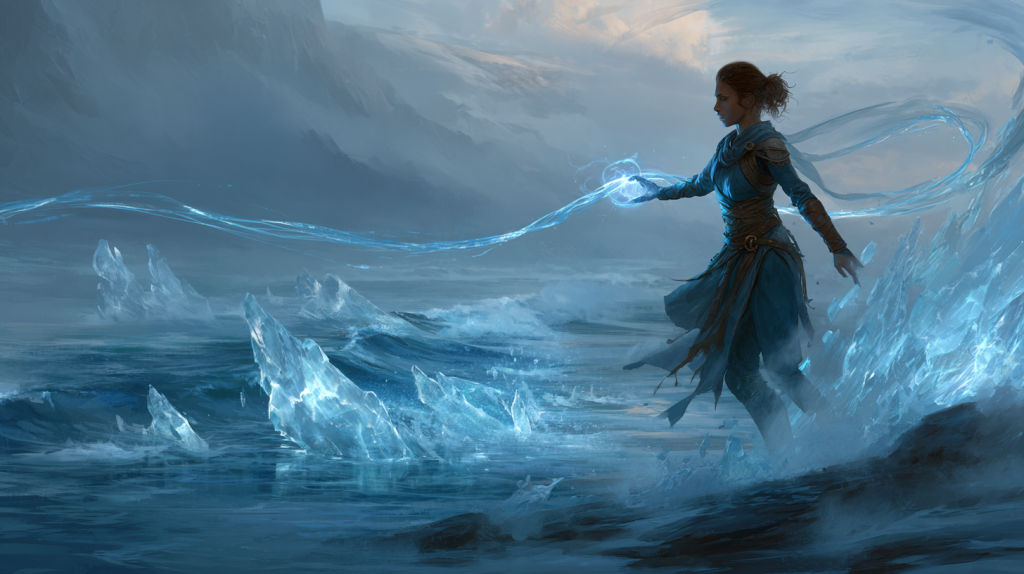 Controlla l’acqua in tutte le sue forme (liquido, ghiaccio, vapore). Utilizzata per controllo, barriere (es. Muro d’Acqua ) e guarigione in senso metaforico (purificazione).