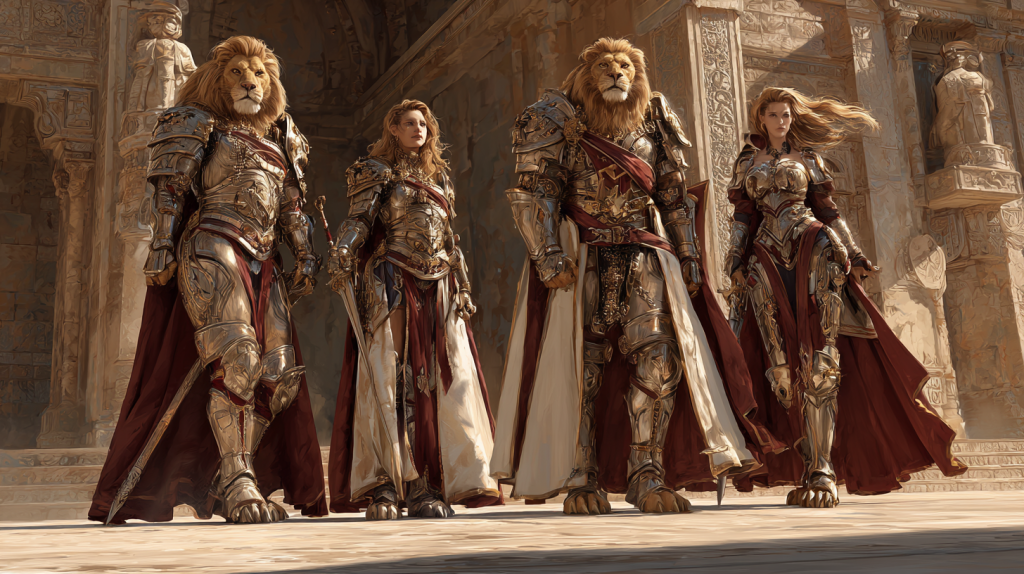 Imponenti e nobili, con criniere maestose e una postura fiera, gli uomini leone si distinguono per il loro naturale carisma e senso di comando. Sono guerrieri coraggiosi, leader nati e difensori delle proprie comunità. La loro cultura è centrata sull’onore, sul clan e sulla protezione dei più deboli, ma possono facilmente scivolare nell’arroganza e nella ricerca ossessiva del potere. Sono spesso visti come figure regali, capaci di ispirare rispetto e timore al tempo stesso.